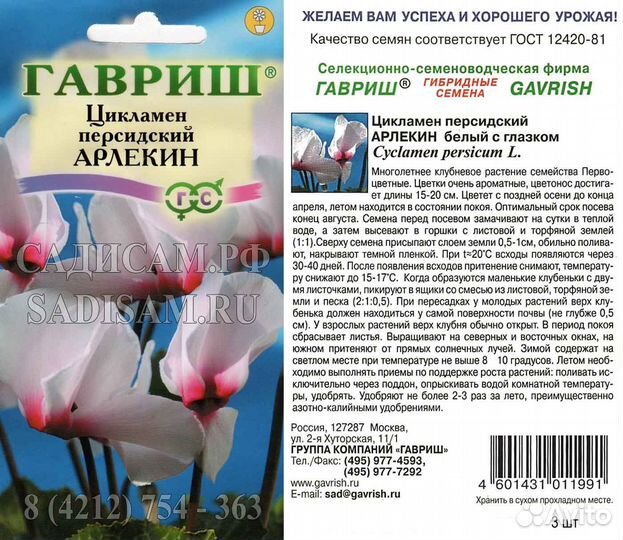 Цикламен Арлекин персидский (Гавриш) Ц 3 шт/ комнат,многолет15-20см,белый с гла