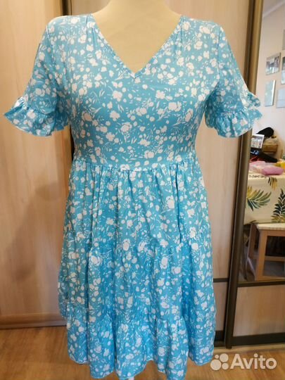 450 ₽Платье женское 42-46Платье женское 42-46Платье голубое,полиэстер, можно одевать на пляж как тунику ,юбочка свободная,плечи 41,грудь 48 полуобхват,талия 43 полуобхват ( талия завышена немного,в зависимости от вашего размера ),длинна по спинке 86.