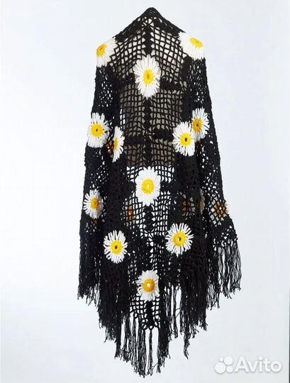 Ажурная чёрная шаль с белыми рамашками