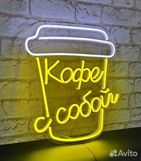 Неоновая вывеска кофе с собой 35 х 40 см (желто-бе