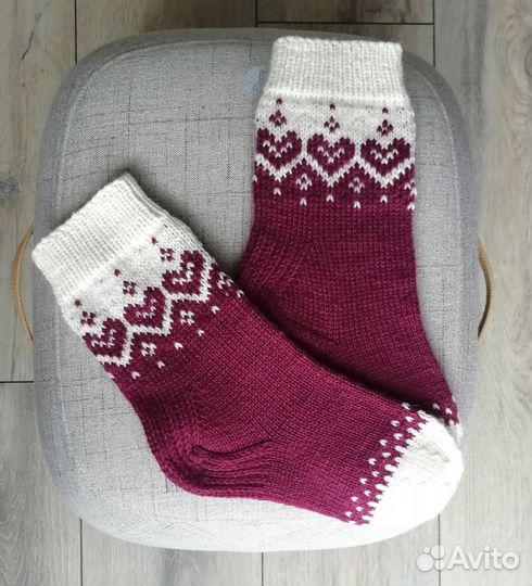 Эти крacивые ноcочки цветa бopдо c бeлыми орнаментами связаны мной из натуральной шерсти высокого качества в технике жаккард, что делает их и очень тёплыми, и нарядными. Они идеально сидят на ноге и имеют хорошую эластичность, но при этом не сдавливают ногу, не нарушают кровообращение и не оставляют следов от тугой резинки. Поэтому они отлично подходят тем, кто страдает от усталости ног, отёков, варикоза и диабета.