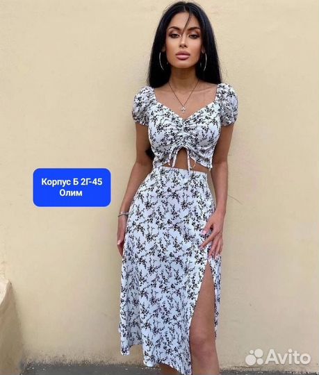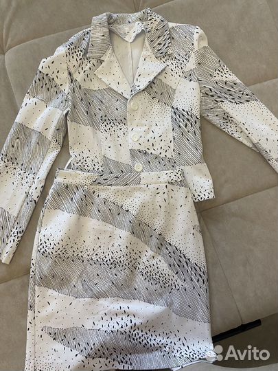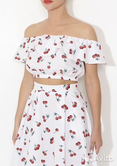 2 500 ₽Летний женский костюм 44Летний женский костюм 44Костюм летний белый с вишенками и юбкой-миди Юбка на молнии сзади.