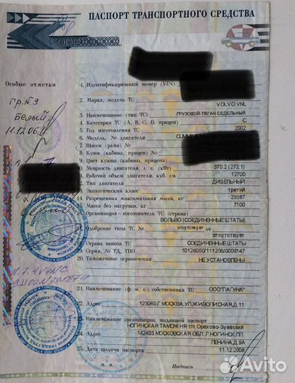 Птс на тягач Volvo VNL
