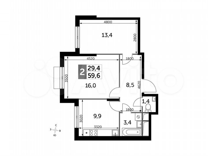 2-к. квартира, 58,2 м², 2/16 эт.