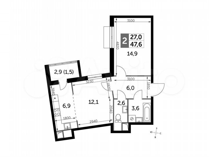 2-к. квартира, 47,5 м², 2/11 эт.