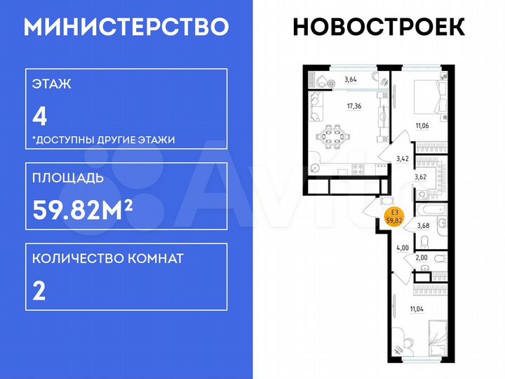 2-к. квартира, 59,8 м², 4/25 эт.
