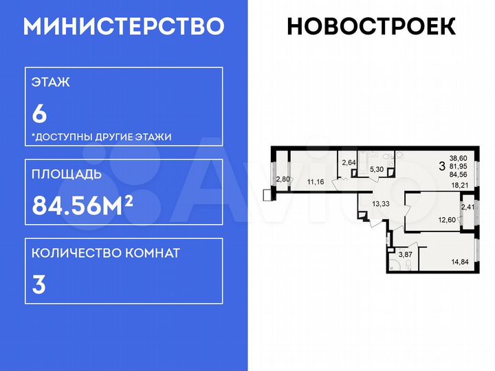 3-к. квартира, 84,6 м², 6/23 эт.