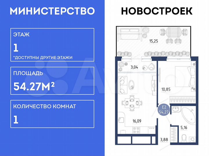 1-к. квартира, 54,3 м², 1/18 эт.