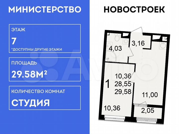 Квартира-студия, 29,6 м², 7/15 эт.