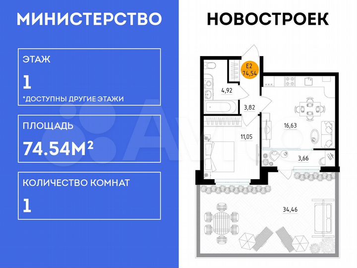 1-к. квартира, 74,5 м², 1/25 эт.