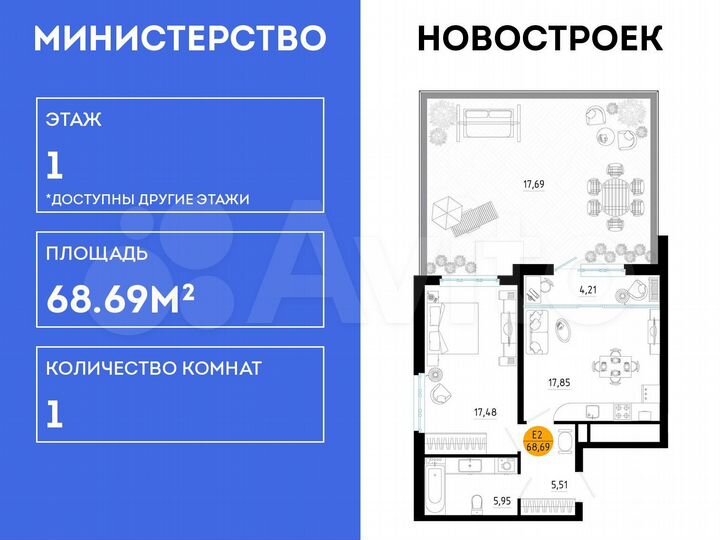 1-к. квартира, 68,7 м², 1/25 эт.