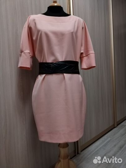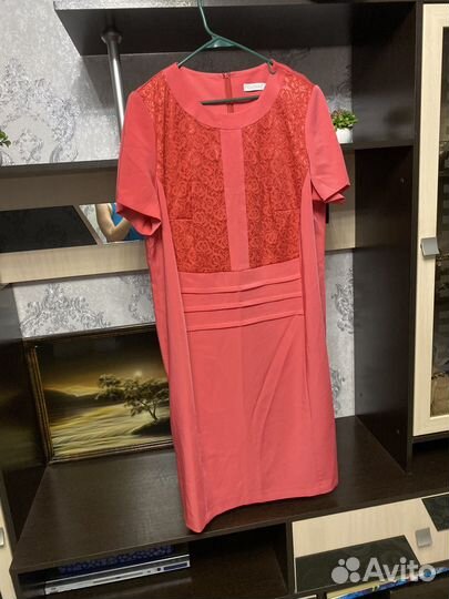 Цвет коралловый. 40-42 размер. Длина -середина бедра. Крой подчеркивает талию.