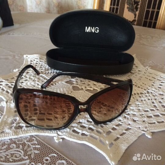 Очки фирмы MNG (оригинал, были куплены в фирменном магазине MNG) в твёрдом чехле, обтянутом чёрной кожей. Оправа удобная, лёгкая. Цвет стёкол - от затемнённого верхнего края к нижнему становится более светлым, что придаёт пикантный вид. Очень красиво выглядит на лице.