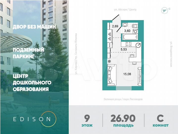 1-к. квартира, 26,9 м², 9/26 эт.