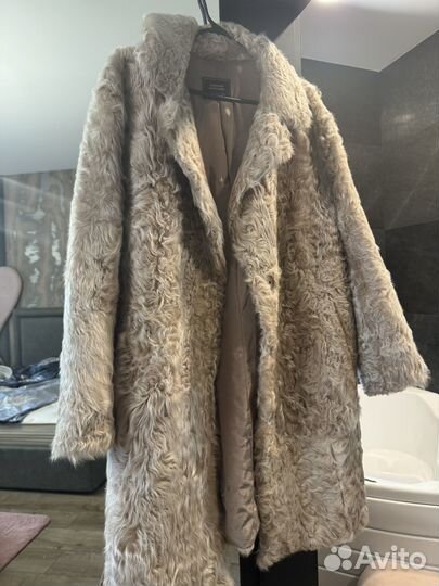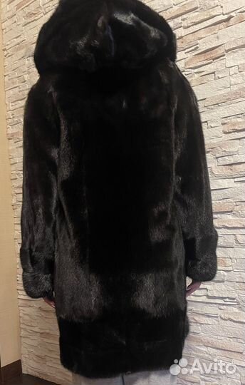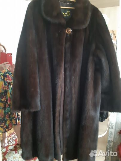 Натуральная мутоновая шуба. Размер 50. Длинна 112 см ширина по спинке от подмышки до подмышки 53 см по переду 56 см, Низ не оббит. Ширина подола 148 см. Застежка крючки для меха. Карман внутренний.