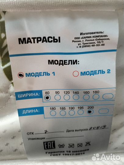 Матрас Сарма 80х190х15