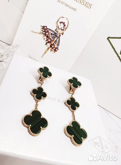 Серьги Van Cleef три мотива малахит