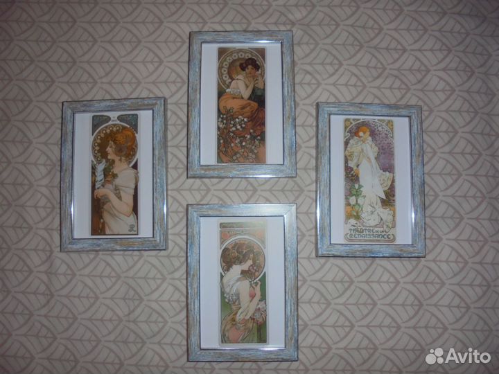 Альфонс Муха 4 панно 12х18 рамка морозное серебро